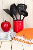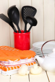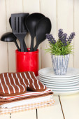 Kuchnia ustawienia: naczynie, chwytaków, ręczniki i jeszcze na drewnianym stole