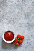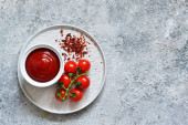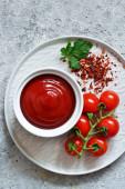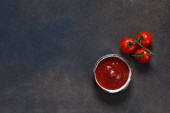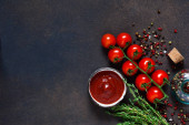 Sos pomidorowy z tymiankiem, chili pieprz i papryka na ciemnym tle.