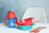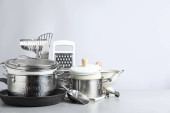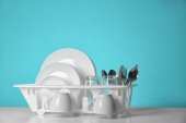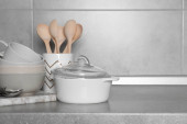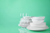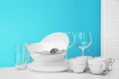 Zdjęcie "Zestaw czyste naczynia na stole przed kolor tła. Miejsca na tekst" może być wykorzystywane do celów osobistych i komercyjnych zgodnie z warunkami zakupionej licencji Royalty-free. Obraz jest dostępny do pobrania w jakości wysokiej rozdzielczości do 5760x3840.