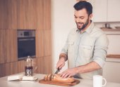 zbliżenie młody człowiek, picia kawy i biorąc od toster toast