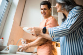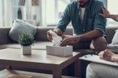 Młody człowiek otwarcia butelce wina patrząc na Pani