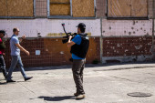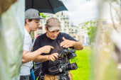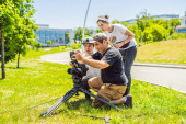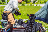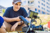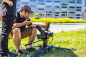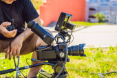 profesjonalny kamerzysta przygotowuje kamery i statywu, przed wykonaniem zdjęcia