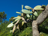 zielone liście w zwiędły kaktusa opuntia ficus-indica (również o nazwie Cactus gruszka, Nopal, opuntia rys., rys. Barbary spineless, kłujące, chumbera) chorych, może koszenila