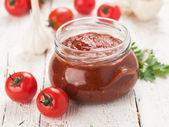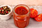 Produkty wykonane z świeżych pomidorów - sos, sok i przyprawy, zbliżenie poziome