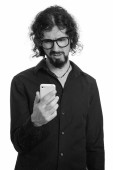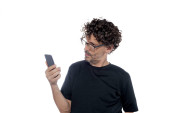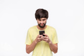 Przystojny biały mężczyzna trzymając telefon komórkowy wygląda na zdenerwowanego