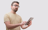 Zdjęcie "Przystojny biały mężczyzna trzymając telefon komórkowy wygląda na zdenerwowanego" może być wykorzystywane do celów osobistych i komercyjnych zgodnie z warunkami zakupionej licencji Royalty-free. Obraz jest dostępny do pobrania w jakości wysokiej rozdzielczości do 5760x3840.