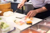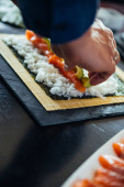 Ręce szefa kuchni przygotowujące japońskie jedzenie, kucharz przygotowujący sushi, przygotowujący sushi roll