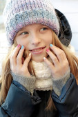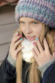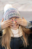 Portret uśmiechający się piękna młoda dziewczyna w czerwona kurtka z kapturem i futro zamknąć - nawet w zimie.