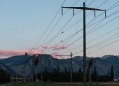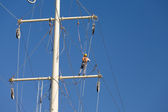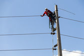 pracy zawodowej mężczyzn na linie wysokiego napięcia wysoko na kraty przecina robi niebezpieczne prace elektryczne