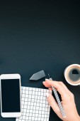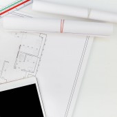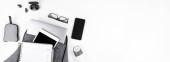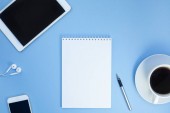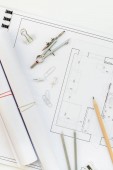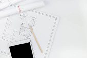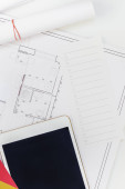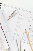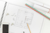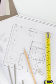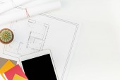 Kreatywnych mieszkanie świeckich napowietrznych góry plany architektoniczne projekt płaski planu i office dostarcza na dekorator biały stół roboczy z próbki narzędzia i sprzęt tło kopia miejsce koncepcji