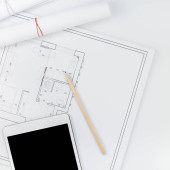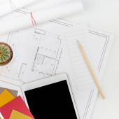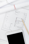 Zdjęcie "Kreatywnych mieszkanie świeckich napowietrznych góry plany architektoniczne projekt płaski planu i office dostarcza na dekorator biały stół roboczy z próbki narzędzia i sprzęt tło kopia miejsce koncepcji" może być wykorzystywane do celów osobistych i komercyjnych zgodnie z warunkami zakupionej licencji Royalty-free. Obraz jest dostępny do pobrania w jakości wysokiej rozdzielczości do 5760x3840.
