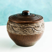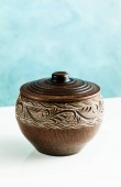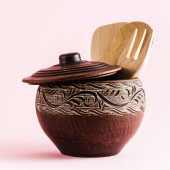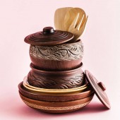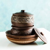 garnki i talerze z gliny na tabelę białe i niebieskie tło. Clay ceramiki naczynia kuchenne wykonane ręcznie. czerwonej gliny naczynia