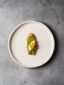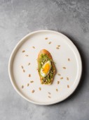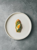 Tosty pełnoziarniste galwanicznie awokado z jaj i świeże zioła mini z nasiona słonecznika i posypane solą czarno na biały ceramika serwowane nad szarym tle betonowych, widok z góry, dieta jedzenie koncepcja, bezglutenowe