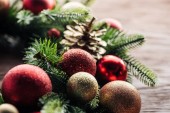 Tło Boże Narodzenie, dekoracje, czerwone kule, stożki i gałęzie jodły