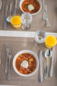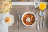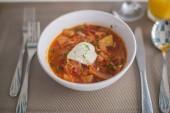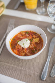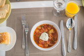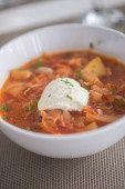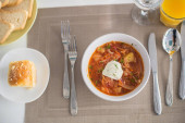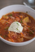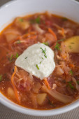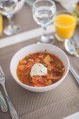 Barszcz, czerwone zupa pomidorowa z buraków i warzyw i śmietany podawane z pieczywem czosnkowym, tradycyjne danie kuchni ukraiński, rosyjski i Polski