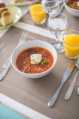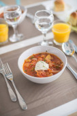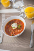 Barszcz, czerwone zupa pomidorowa z buraków i warzyw i śmietany podawane z pieczywem czosnkowym, tradycyjne danie kuchni ukraiński, rosyjski i Polski