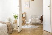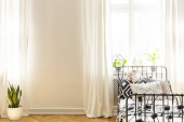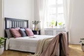 Kolorowe poduszki na dziecięce łóżko w sypialni białe wnętrze z gabinetu i kopiować miejsca. Prawdziwe zdjęcie