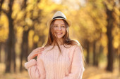Piękna kobieta z kapelusz i papier cup w jesienny park