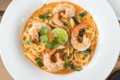 Spaghetti z tiger krewetki smażone krewetki oleju w płycie