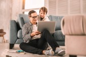 Zdjęcie "Mądry ojciec chwalenie się do jego małego chłopca o jego postępie prac." może być wykorzystywane do celów osobistych i komercyjnych zgodnie z warunkami zakupionej licencji Royalty-free. Obraz jest dostępny do pobrania w jakości wysokiej rozdzielczości do 5760x3840.