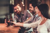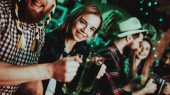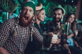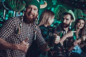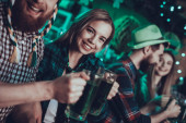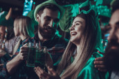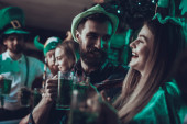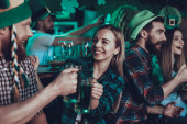 Saint Patrick's Day Party. Grupa przyjaciół jest Świętujmy. Szczęśliwi ludzie jest Toast i picia piwa Green. Znajomych jest młodych mężczyzn i kobiet. Ludzie sobie zielone czapki. Wnętrze pubu.