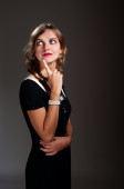 młoda kobieta w niebieską koszulę z tkania długie włosy i semiclosed