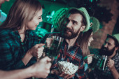 Saint Patrick's Day Party. Grupa przyjaciół jest Toast z zielone piwo. Znajomych jest szczęśliwy młodych mężczyzn i kobiet. Barman stoi Bar licznika. Ludzie sobie zielone czapki. Wnętrze pubu.