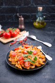 zbliżenie ugotowany makaron z sosem pomidorowym i serem na ciemnym tle