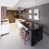 Luksusowy bar licznika z czarnego marmuru, z drewnianą deskę z nakrętki i dwie skórzane stołki w sali współczesnej kuchni. renderowania 3D.
