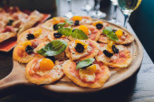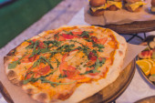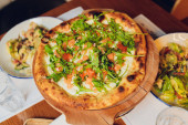 Turecki i arabski tradycyjnych Ramadan Pide z jajkiem na wierzchu. Podłoże drewniane. Pizza Margherita jest typowe neapolitańskie, wykonane z pomidory, mozzarella, świeża bazylia, oliwa z oliwek pierwszego tłoczenia i soli.