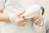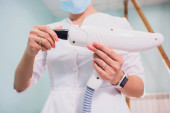 specjalista utrzymuje rękojeść do usuwania włosów w ręce na zabieg kosmetyczny