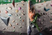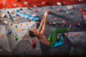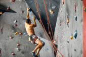 Panoramiczny mężczyzna głaszczący się w krytym centrum wspinaczkowym.
