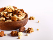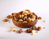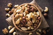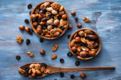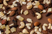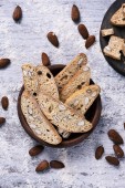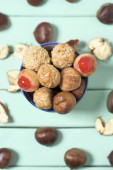 wysoki kąt widzenia pan de higos, hiszpański słodkości z fig, zazwyczaj spożywane w czasie świąt Bożego Narodzenia, zwieńczona różnych orzechów, na drewnianym stole
