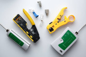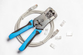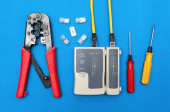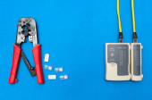 Zdjęcie "Cripmer narzędzie i sieci kablowej tester na białym tle na niebieskim tle. Tło maitenance sieci z miejsca kopii." może być wykorzystywane do celów osobistych i komercyjnych zgodnie z warunkami zakupionej licencji Royalty-free. Obraz jest dostępny do pobrania w jakości wysokiej rozdzielczości do 5760x3840.