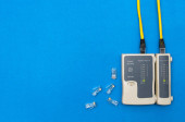 Cripmer narzędzie i sieci kablowej tester na białym tle na niebieskim tle. Tło maitenance sieci z miejsca kopii.
