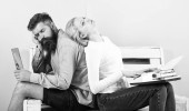 Zdjęcie "Para zrelaksować się rano z kawy. Para w Uwielbiam pić kawę w łóżku. Mężczyzna i kobieta w krajowych ubrania, piżamy. Idealna koncepcja rano i miłości. Facet z brodą kawę z marzycielski Pani" może być wykorzystywane do celów osobistych i komercyjnych zgodnie z warunkami zakupionej licencji Royalty-free. Obraz jest dostępny do pobrania w jakości wysokiej rozdzielczości do 5760x3840.