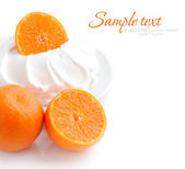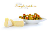 zielone oliwki, olej, kromki chleba i sera są na białym tle
