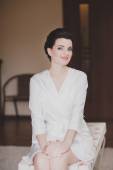 W ciąży kobieta w czerwonej sukience, leżąc na kanapie