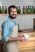 Uśmiechnięty kelner gospodarstwa białe płytki z naleśniki dla klientów