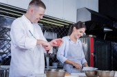 Ciemnowłosa chef pomiaru Sałatka przed podaniem go do klienta