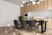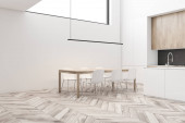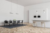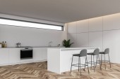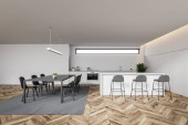 Wnętrze nowoczesna kuchnia z białe ściany, drewniane podłogi, biały pasek, stołki, Szafka z piekarników i szary stół z krzesłami. renderowania 3D