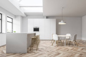 Zdjęcie "Wnętrze nowoczesna kuchnia z białe ściany, drewniane podłogi, biały pasek, stołki, Szafka z piekarników i szary stół z krzesłami. renderowania 3D" może być wykorzystywane do celów osobistych i komercyjnych zgodnie z warunkami zakupionej licencji Royalty-free. Obraz jest dostępny do pobrania w jakości wysokiej rozdzielczości do 5760x3840.