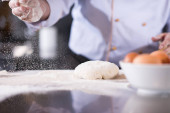 Ręce kobiece piekarz wyrabia ciasto na stole z mąki, jaj i innych składników.