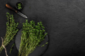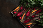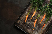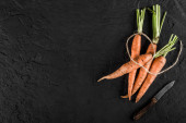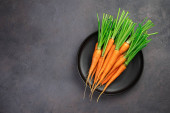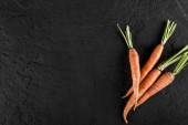 Świeża marchew kiść na talerzu na ciemnym tle kamienia. Koncepcja jedzenie, widok z góry, miejsce
