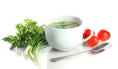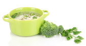 Dietetyczna zupa z warzywami w filiżance izolowanej na białym