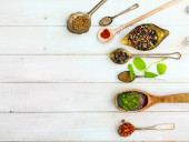 Zdjęcie "Różnych przypraw i ziół w drewniane łyżki. Przyprawy płaski świeckich składników chili, pieprzu, rosemarry, tymianek, anyż, liści szałwii i bazylią na shabby drewniane." może być wykorzystywane do celów osobistych i komercyjnych zgodnie z warunkami zakupionej licencji Royalty-free. Obraz jest dostępny do pobrania w jakości wysokiej rozdzielczości do 5760x3840.