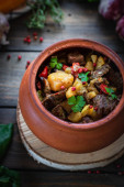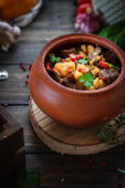 Zdjęcie "Koncepcja uzbeckim, dania kuchni orientalnej. Pilaw w patelni żeliwnych, kawałkami jagnięciny leży na drewnianym stole. Zestaw świąteczny stół." może być wykorzystywane do celów osobistych i komercyjnych zgodnie z warunkami zakupionej licencji Royalty-free. Obraz jest dostępny do pobrania w jakości wysokiej rozdzielczości do 5760x3840.