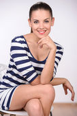 Portret młodej kobiety piękne na szarym tle trzymać ręce w pobliżu jej twarz i uśmiech do kamery