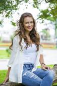 Portret młodej kobiety piękne Blondynka w szary płaszcz na tle jesieni ulicy