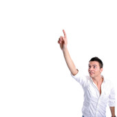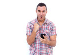 Portret szczęśliwy człowiek z telefonu komórkowego i skierowaną w górę na na białym tle